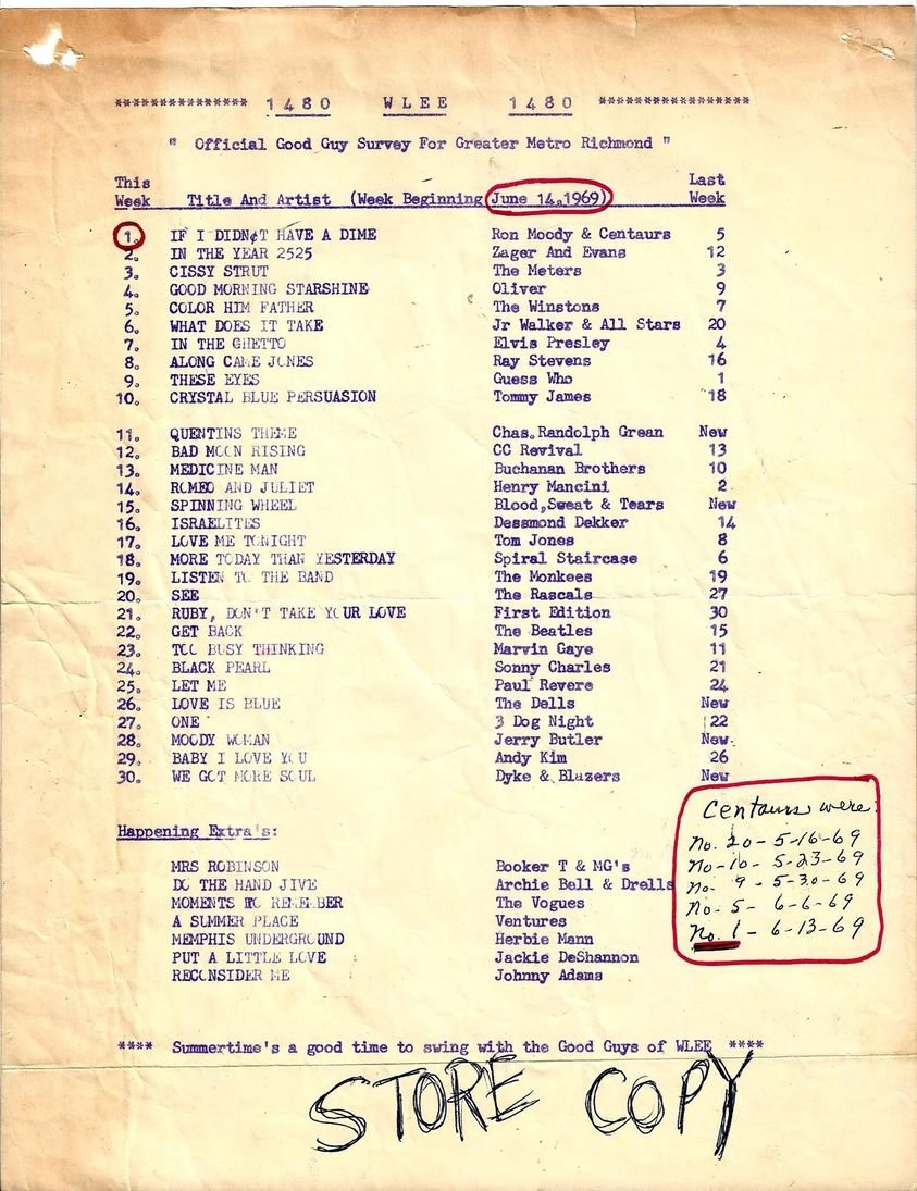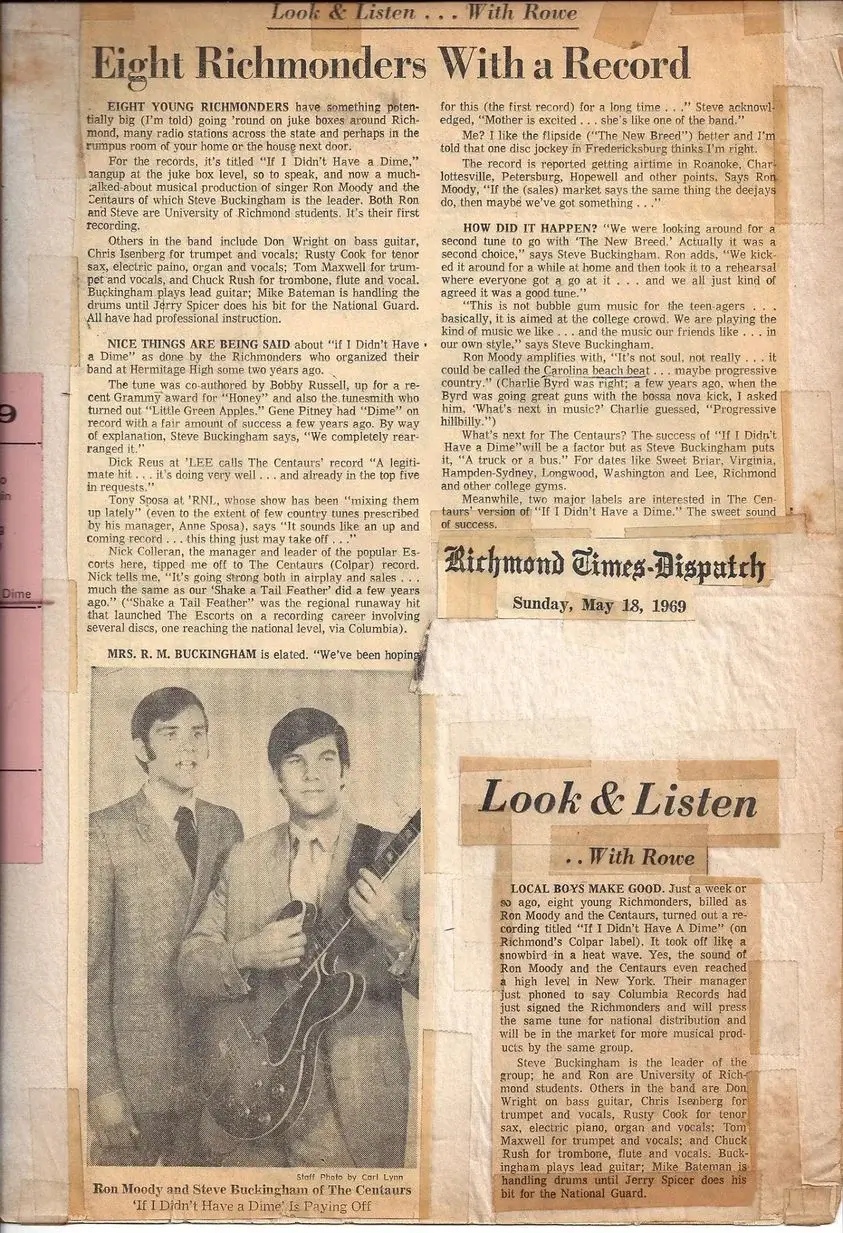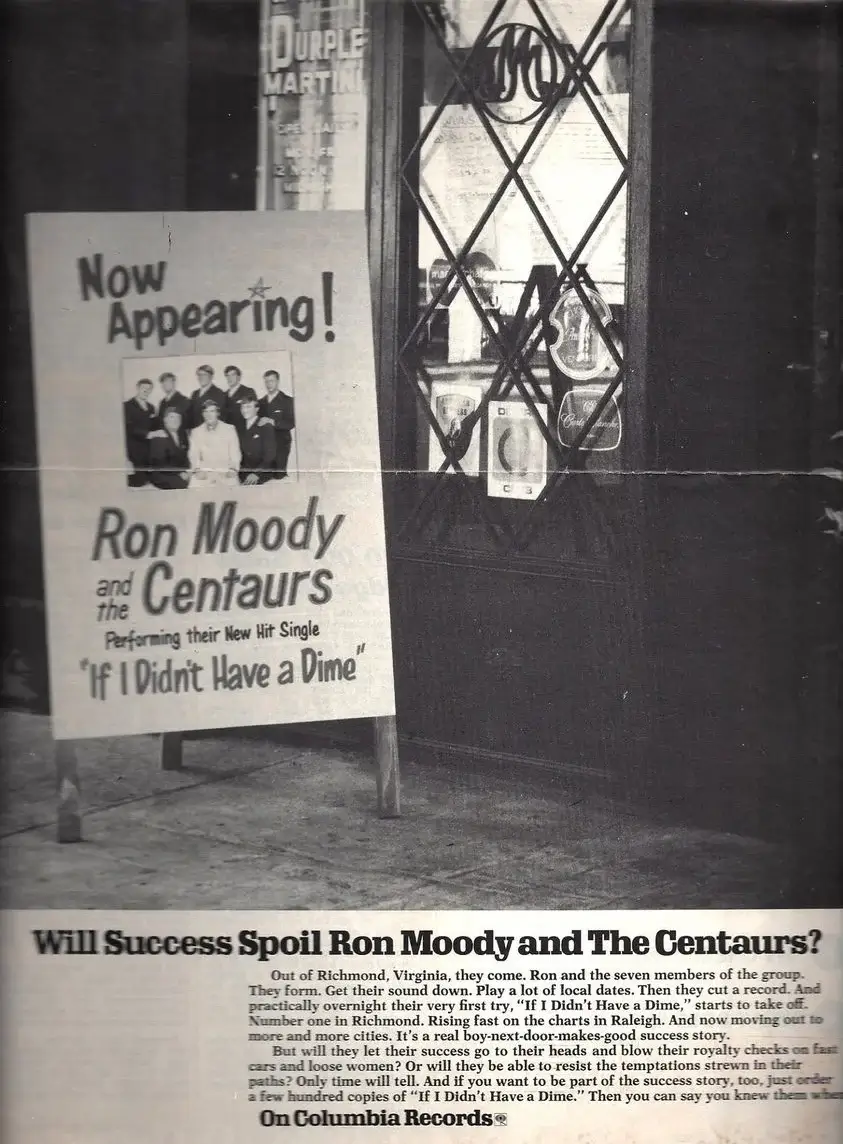 In 1969, The Centaurs decided to record their first single. Hot on the heels of the success of fellow Virginians, Bill Deal and the Rhondels, the band made the trip to Baltimore in March of that year to try their luck. The results were surprising to the entire band. With their very first attempt, the single, “If I Didn’t Have a Dime” was purchased within weeks of recording by Columbia Records and by May it was pressed on their prestigious red label! It was at this time Ron Moody and the Centaurs really began to explode. The band, then in college, performed throughout The Southeast at clubs, fraternities, and arenas, sharing the stage with such legendary acts as The Impressions, The Drifters. Billy Stewart, Jr. Walker & the All Stars, Chubby Checker, Billy Joe Royal, and Percy Sledge.
